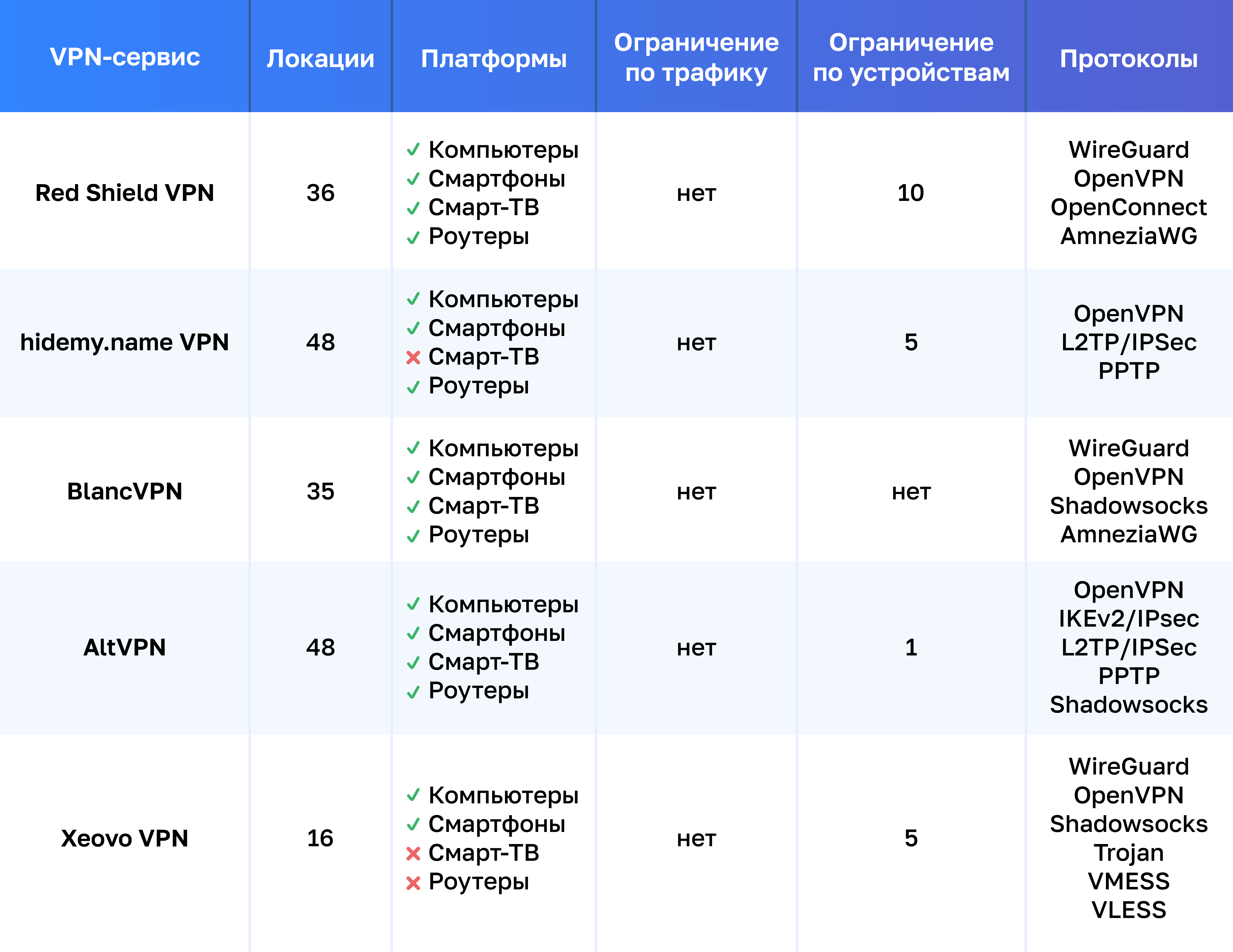 Ни один из сервисов не ограничивает трафик, однако ограничений по количеству устройств нет только у BlancVPN.