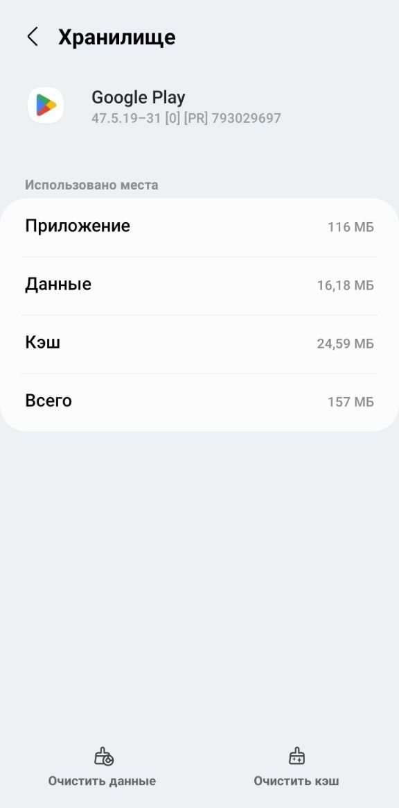 7. Закройте Google Play. Откройте "Настройки", пункт "Приложения". Найдите в списке Google Play, кликните на него, выберите "Хранилище", очистите данные и кэш.