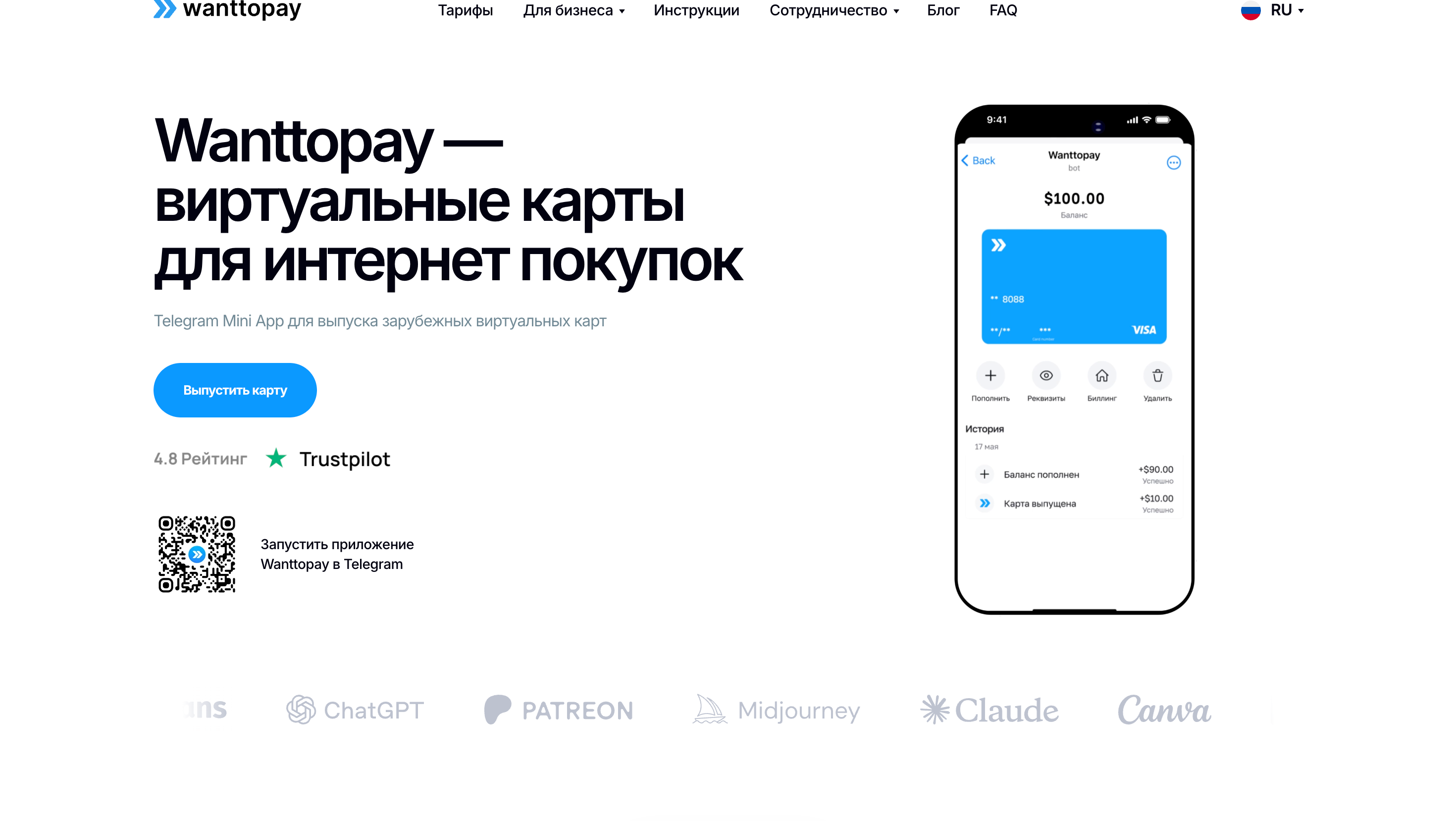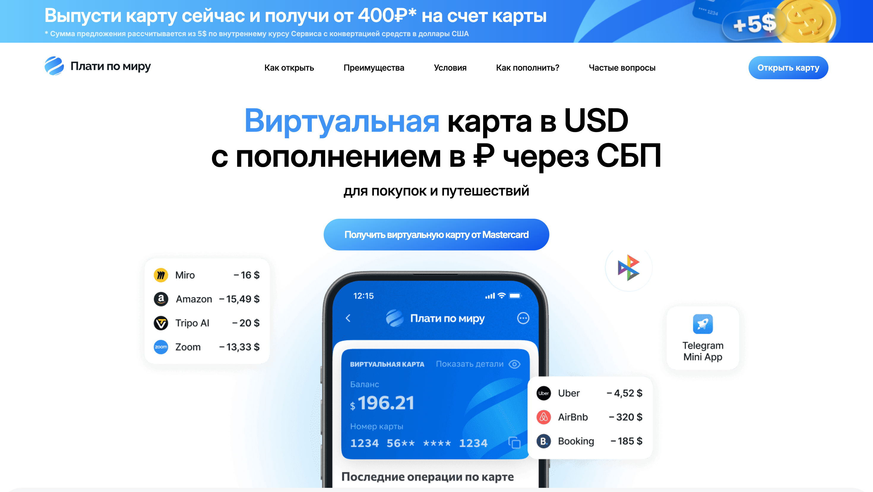 Плати по миру позволяет оформить виртуальную карту в USD с регионом Гонконг, чтобы оплачивать любые зарубежные сервисы. Сервис также появился примерно в начале 2020-х. Приложения у него нет, использовать можно через веб-кабинет и бот в Telegram. Для удобства оплаты через смартфон карту можно привязать к Apple Wallet. В отзывах отмечают высокий курс конвертации и комиссии за выпуск.