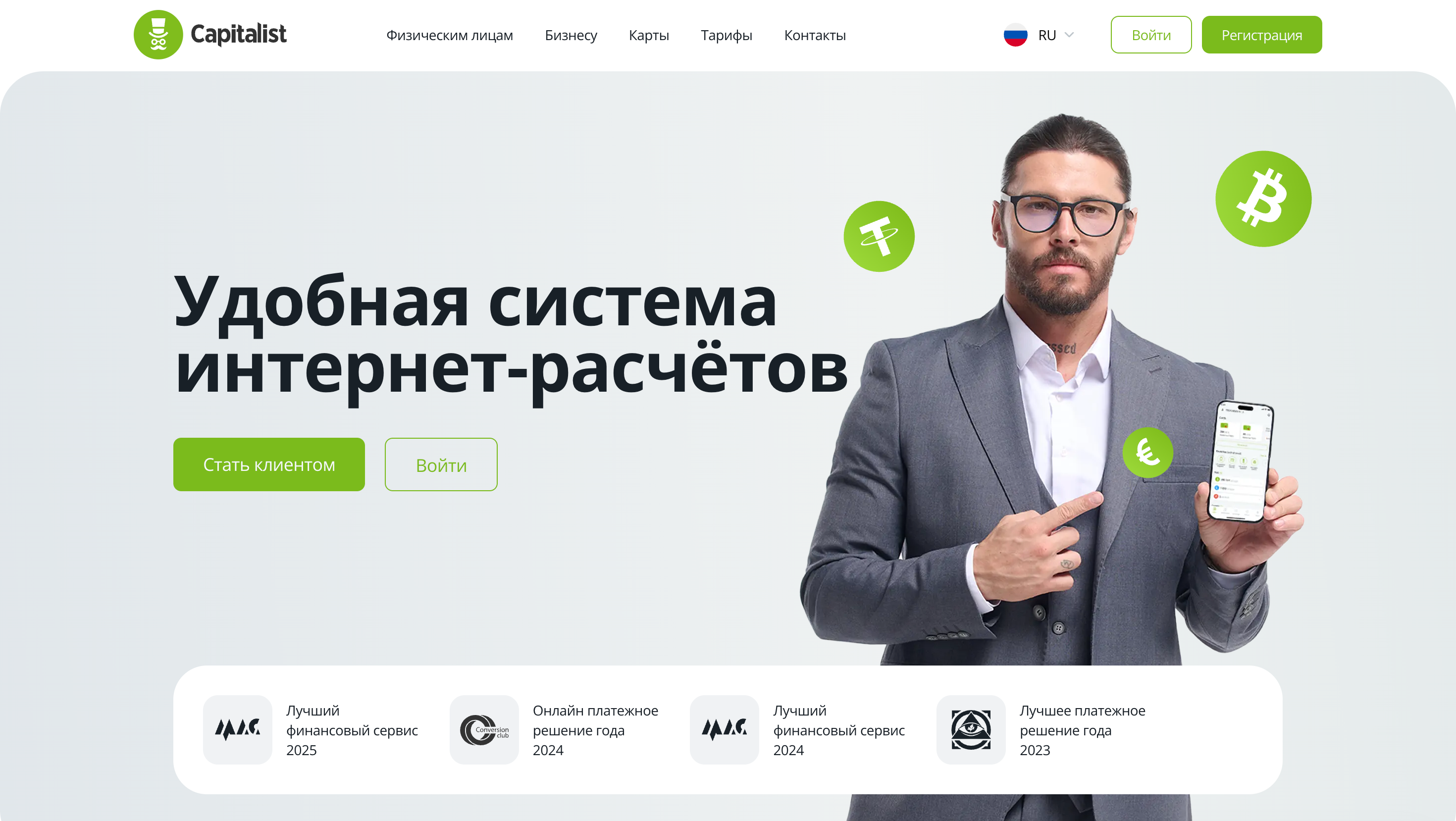 Capitalist — агент с устоявшейся сетью партнеров-эмитентов. Сервис создает счета сразу в семи валютах — рубль, евро, доллар, Bitcoin, Ethereum, USDC (USD Coin) и USDT (Tether) — с возможностью добавления новых. Пользователи отмечают высокий курс при конвертации, большое количество запрещенных операций, некоторые жалуются на обязательную верификацию.