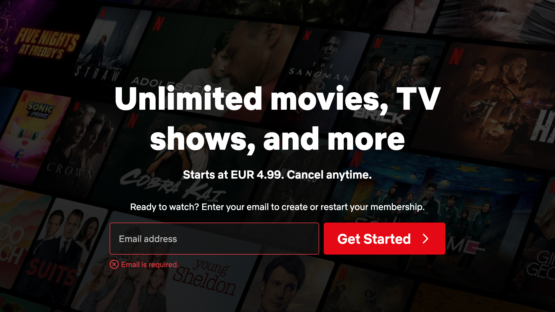 Откройте сайт www.netflix.com, введите электронную почту, нажмите “Get started”.