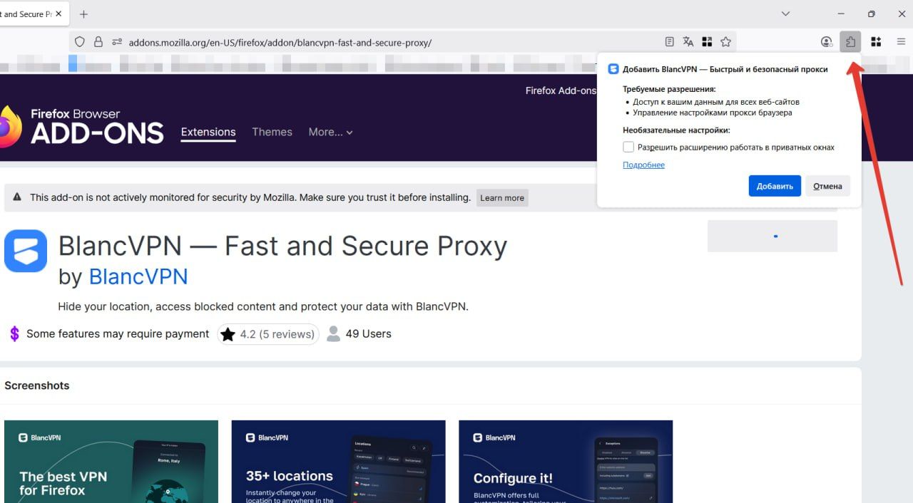 Скачать расширение BlancVPN можно в каталоге addons.mozilla.org. Перейдите по ссылке или найдите VPN через поиск в том же каталоге.