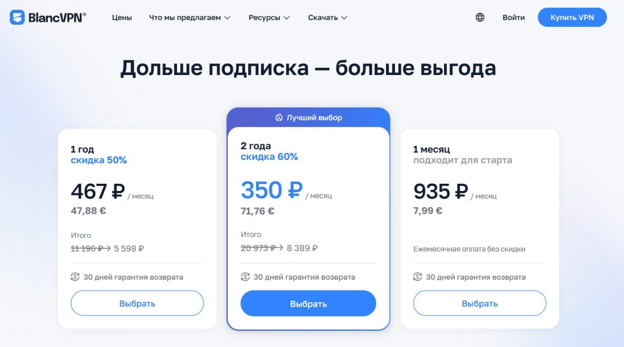 После того, как вы нажмете кнопку “Оформить подписку”, вас перенаправит на сайт BlancVPN. Выберите план и оплатите удобным способом: картой российского или зарубежного банка, Apple Pay, Google Pay или криптовалютой.